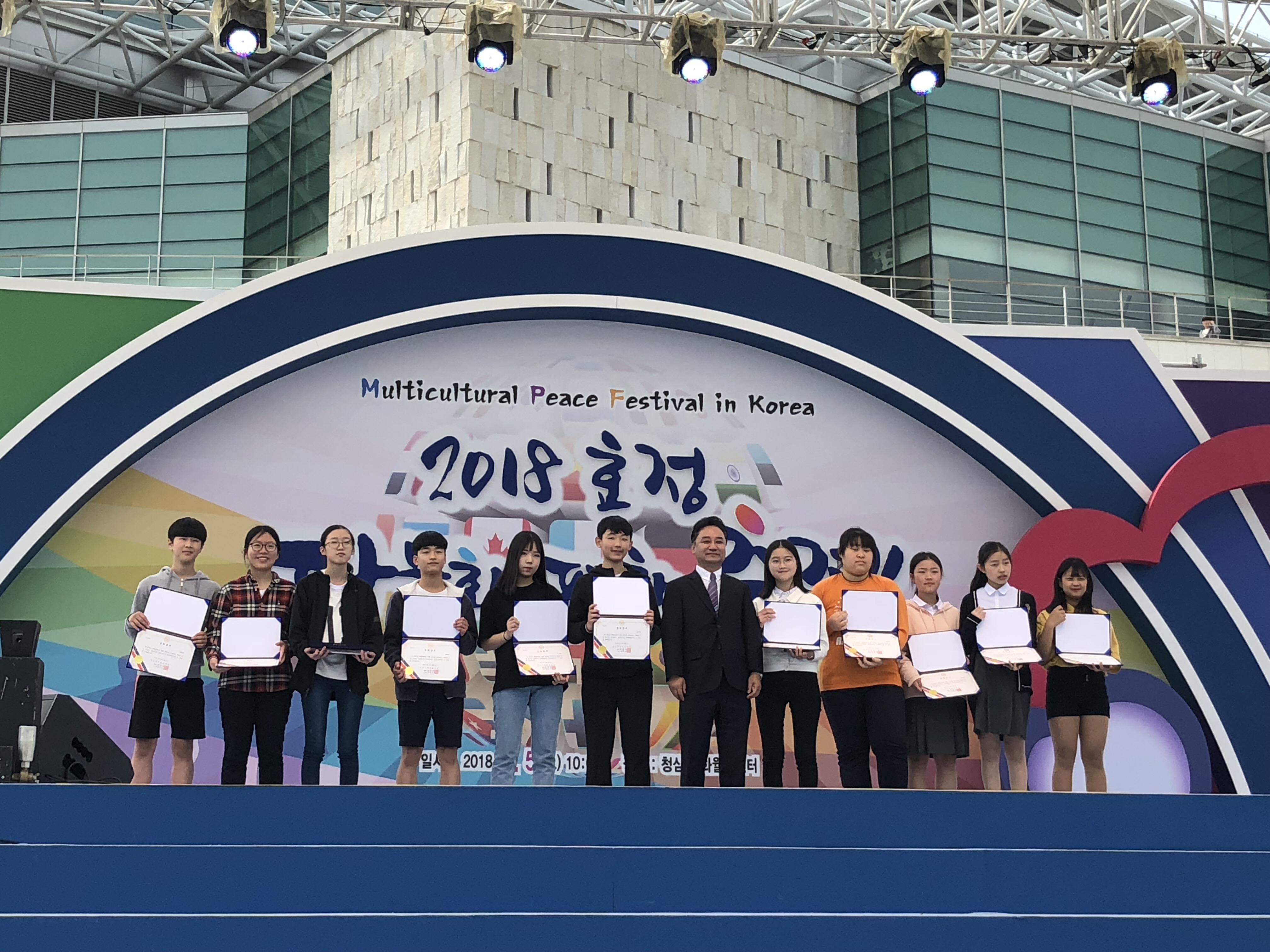 가평군 소재 청심평화월드센터 잔디광장에서 진행된 "2018 효정 다문화 평화축제"의 1부 행사 중 진행된 이번 장학증서 수여식에는 선발된 장학생 11명이 참석하였습니다. 장학생들은 이번 여름방학기간에 해외 영어어학연수 비용을 지원받게 됩니다.