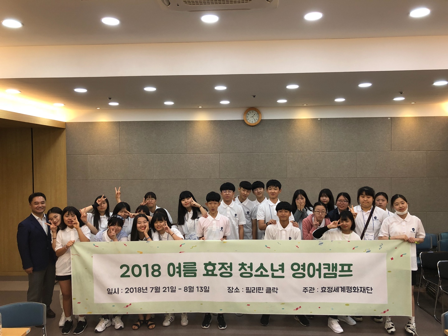 2018 여름 효정청소년영어캠프가 7월 21일에 시작됐다. 경기도 가평군 설악면 소재 설악중학교에 재학중인 25명의 청소년이 참석한 이번 청소년영어캠프는 7월 21일 한국에서 원모평애장학원의 사무총장의 비전교육과 황우혁강사의 동기부여 및 목적의식 교육을 받고 출국하여 지금 필리핀 클락에서 진행중에 있다. 2018년 겨울캠프를 첫 시작으로 2번째 여름 캠프로 효정세계평화재단에서는 청소년들의 영어실력향상을 통해 글로벌 마인드 향상을 도모하고 향후 미래 지도자로의 성장을 돕기위해 매 방학을 이용하여 설악면 지역의 청소년들의 교육을 지속적으로 지원할 예정이다.